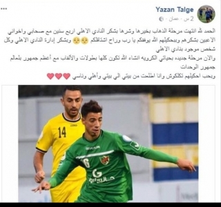و قد ودع النجم الدولي يزن ثلجي، فريقه السابق الأهلي، بكلمات رقيقة كتبها على صفحته الشخصية بموقع التواصل الاجتماعي ، وذلك بعدما خاض مع الاهلي مساء السبت آخر مبارياته أمام الرمثا في ختام مرحلة ذهاب دوري المحترفين الأردني بكرة القدم.