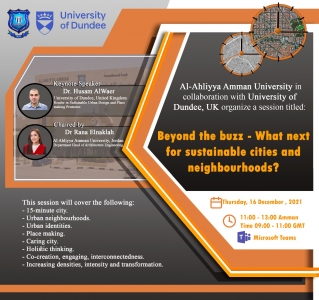 عقدت كلية العمارة والتصميم في جامعة عمان الأهلية ورشة عمل دولية مع جامعة دندي ( المملكة المتحدة) حول (ما التالي حول المدن والأحياء المستدامة في العالم العربي؟ ) بعنوان :